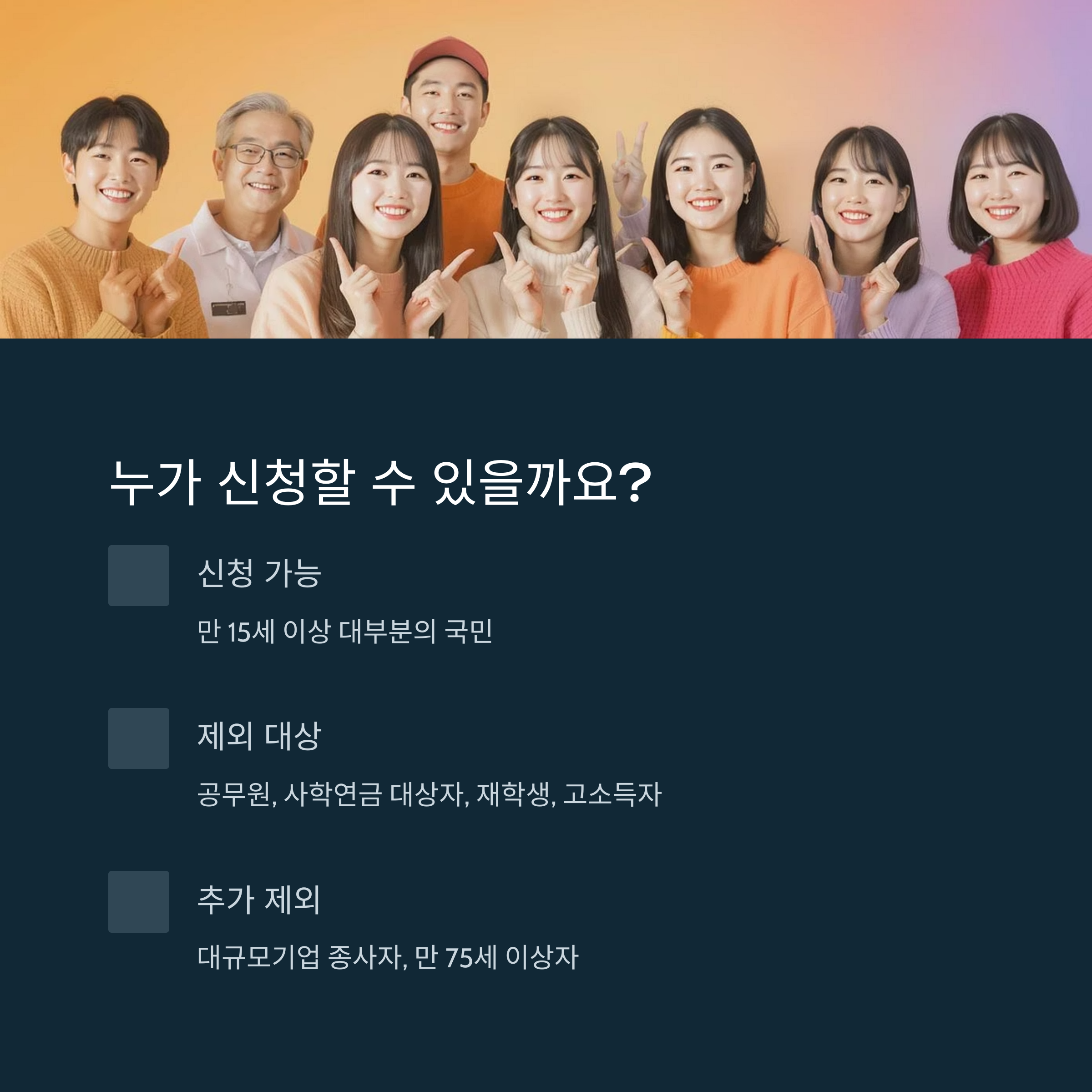 그렇다면 누가 신청할 수 있을까요? 기본적으로 만 15세 이상이면 누구나 가능하지만, 몇 가지 제외 대상이 있으니 꼼꼼히 확인하시면 되시겠습니다.