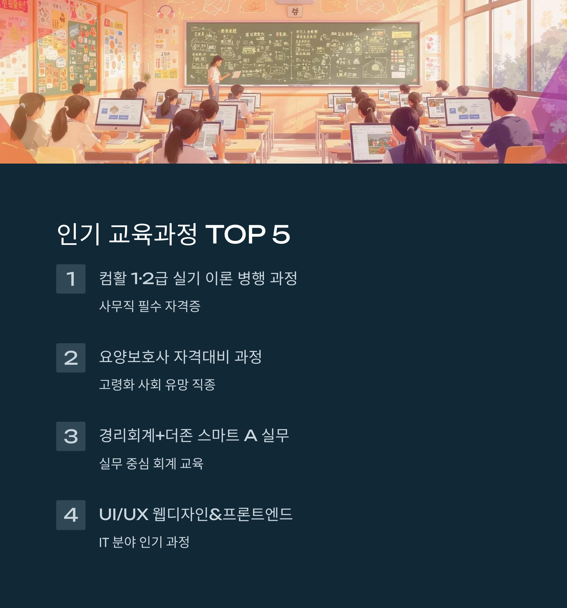 | 1위 | 컴활 1·2급 실기 이론 병행 과정 | 사무직 필수 자격증 |