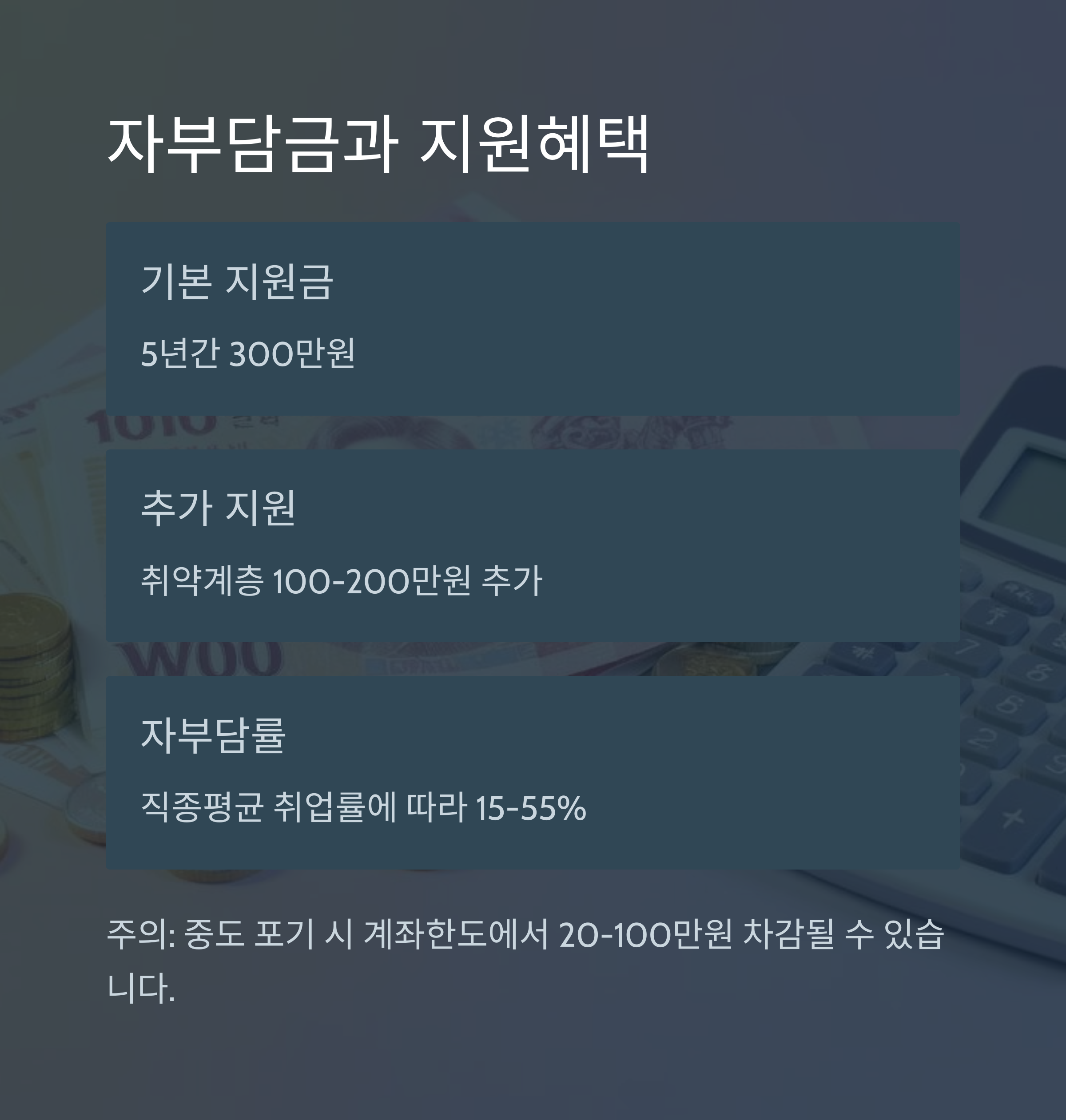 많은 분들이 궁금해하시는 비용 부분을 자세히 설명해볼까요? 기본적으로 5년간 300만원이 지원되며, 저소득층이나 비정규직 근로자 등 취약계층의 경우 추가로 100-200만원을 더 지원받을 수 있습니다.