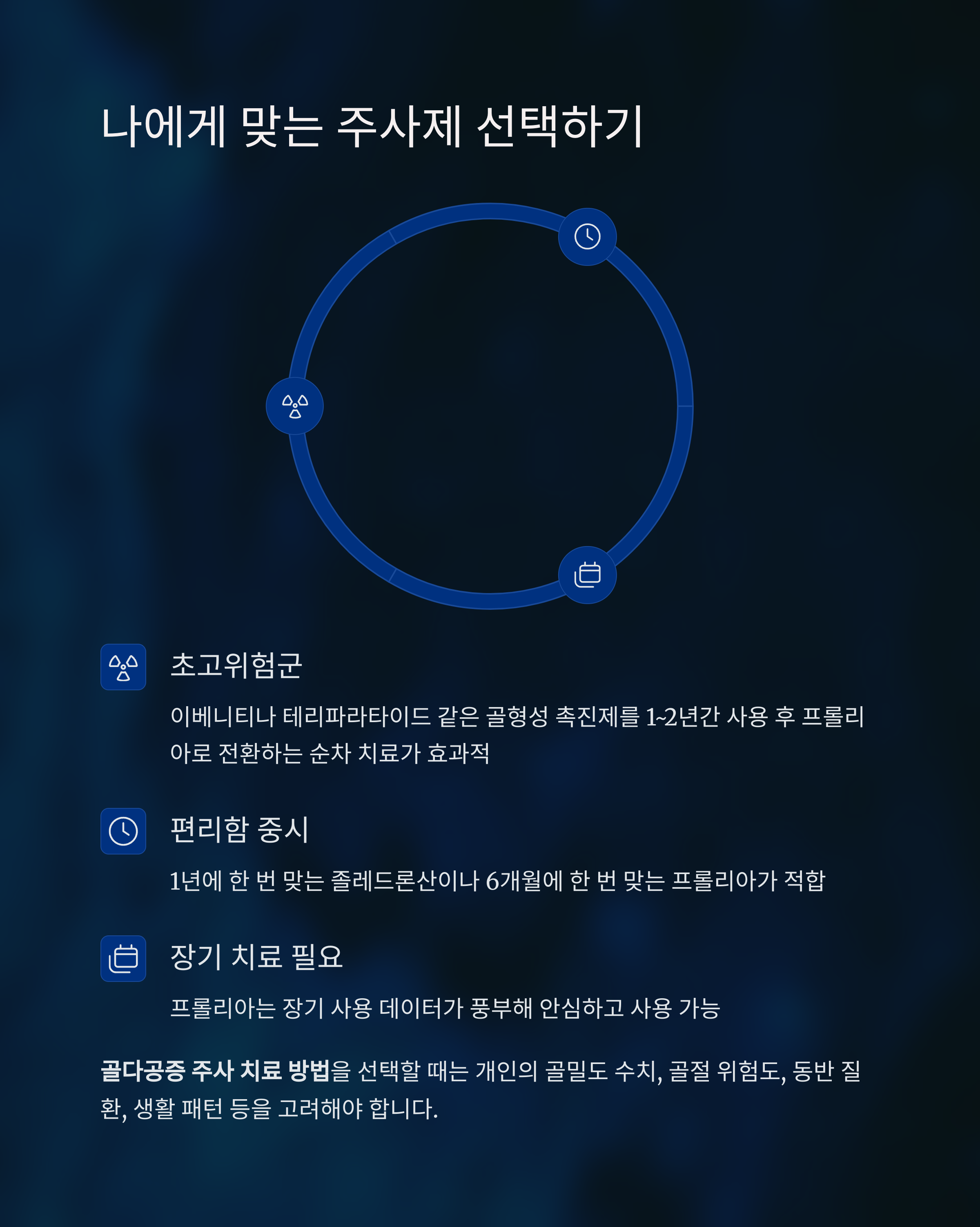 - 편리함을 중시하는 경우: 1년에 한 번 맞는 졸레드론산이나 6개월에 한 번 맞는 프롤리아가 적합합니다.
