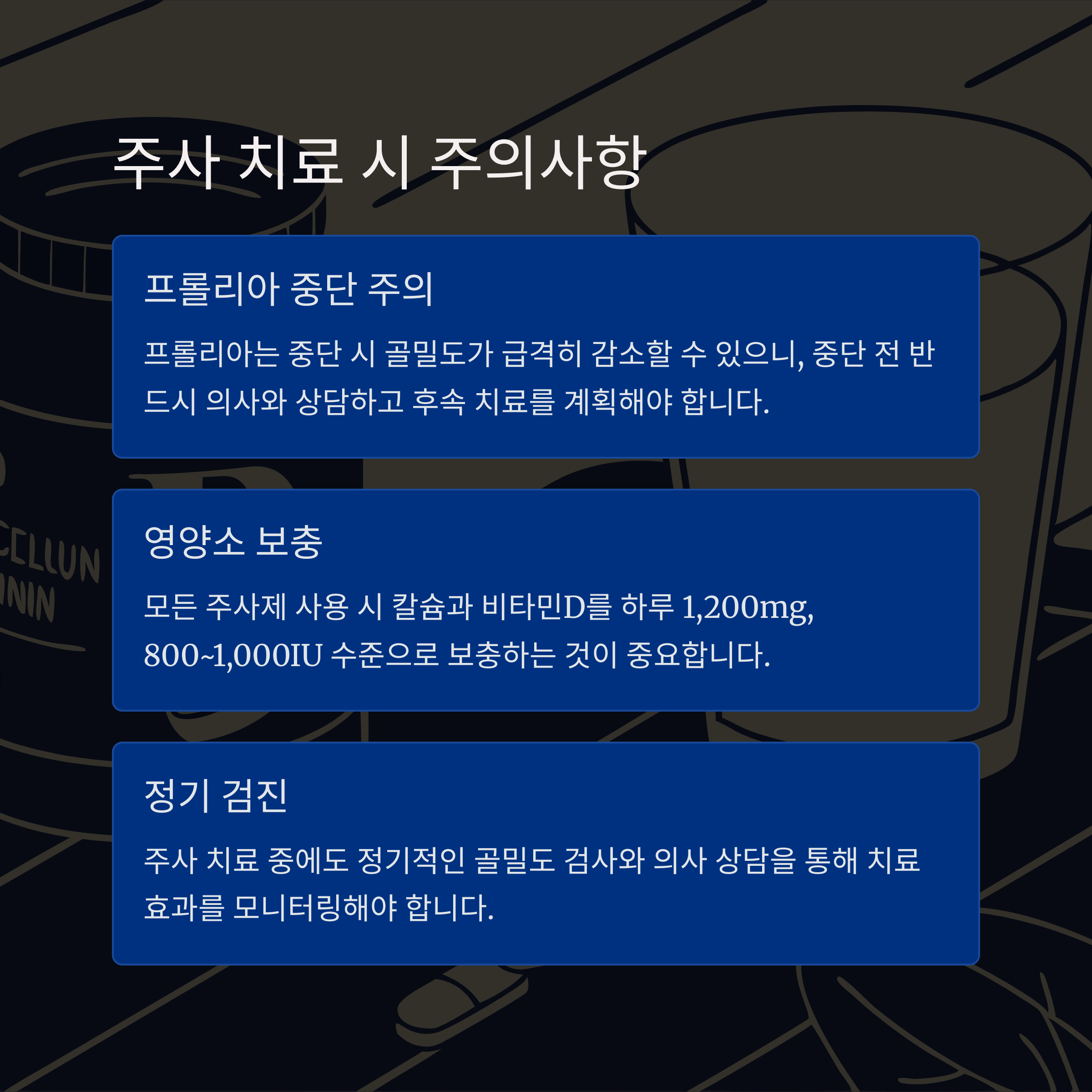 골다공증 주사 치료 방법을 선택하셨다면, 치료 후에도 꾸준한 관리가 필수입니다. 특히 프롤리아의 경우 중단 시 골밀도가 급격히 감소할 수 있으니, 중단 전 반드시 의사와 상담하시고 후속 치료를 계획하셔야 합니다. 또한 모든 주사제 사용 시 칼슘과 비타민D를 하루 1,200mg, 800~1,000IU 수준으로 보충하시는 것이 중요합니다.