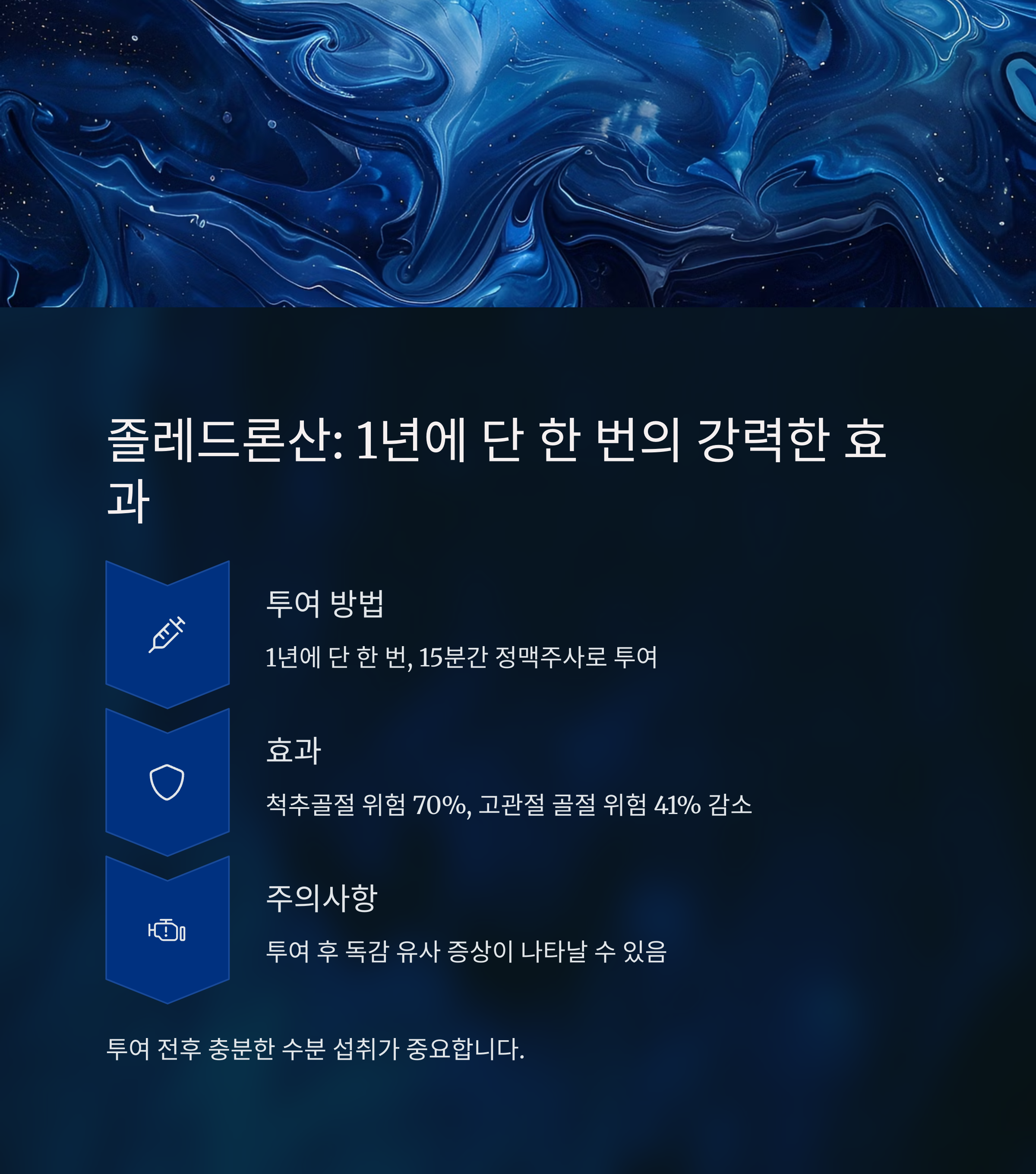 | 졸레드론산 | 졸레드론산 | 1년 1회 | 척추골절 70% 감소, 고관절 골절 41% 감소 | 가장 긴 투여 간격, 강력한 효과 | 투여 후 발열·근육통, 신장 기능 주의 |