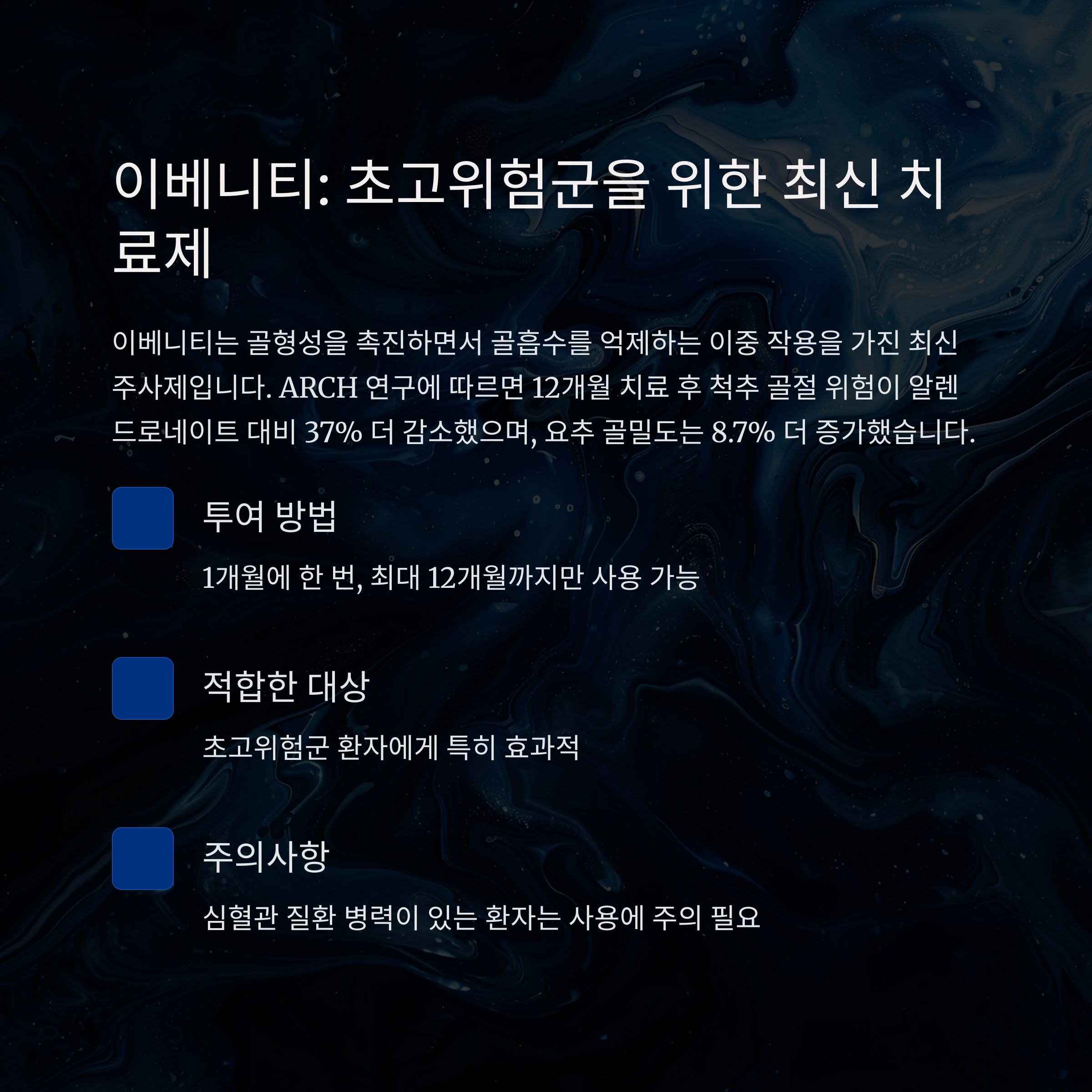 | 이베니티 | 로모소주맙 | 1개월 1회 (12개월 제한) | 척추 골절 37% 추가 감소, 골형성+골흡수 억제 | 초고위험군에 효과적 | 심혈관 질환 위험, 투여 후 골흡수 억제제 전환 필수 |