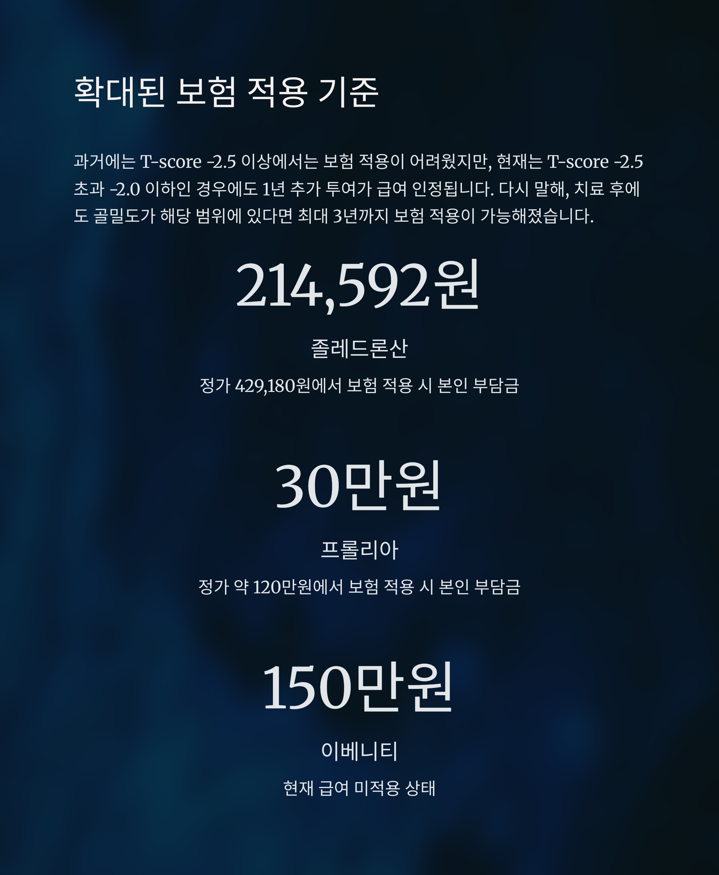 이처럼 과거에는 T-score -2.5 이상에서는 보험 적용이 어려웠지만, 현재는 T-score -2.5 초과 -2.0 이하인 경우에도 1년 추가 투여가 급여 인정됩니다. 다시 말해, 치료 후에도 골밀도가 해당 범위에 있다면 최대 3년까지 보험 적용이 가능해졌습니다.