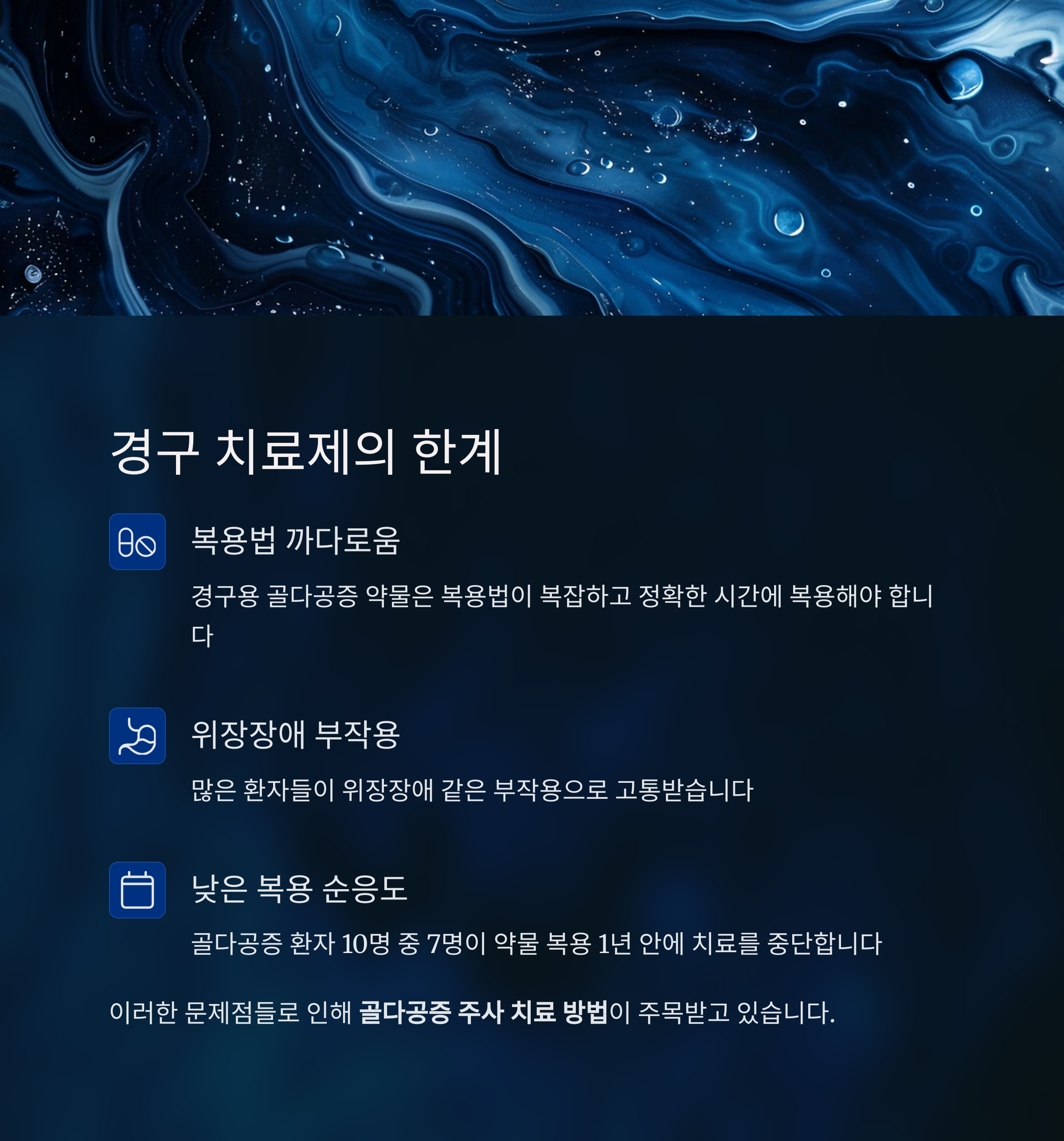 경구용 골다공증 약물은 복용법이 까다롭고 위장장애 같은 부작용 때문에 많은 환자분들이 중단하시는 경우가 많습니다. 실제로 골다공증 환자 10명 중 7명이 약물 복용 1년 안에 치료를 중단한다는 조사 결과가 있습니다. 이처럼 복용 순응도가 낮은 문제를 해결하기 위해 골다공증 주사 치료 방법이 주목받고 있습니다.