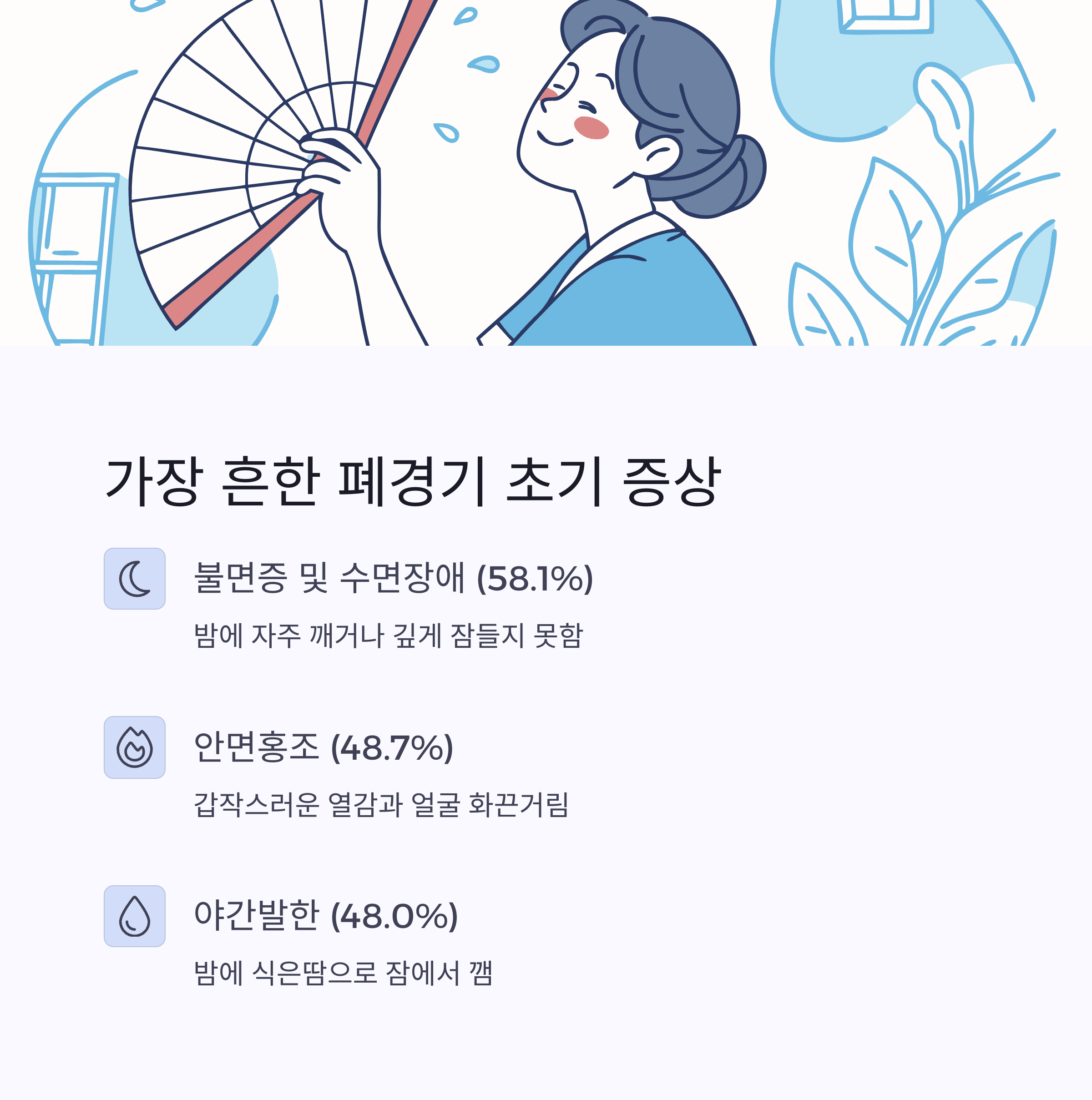 | 안면홍조 | 48.7% | 갑작스러운 열감과 얼굴 화끈거림 |